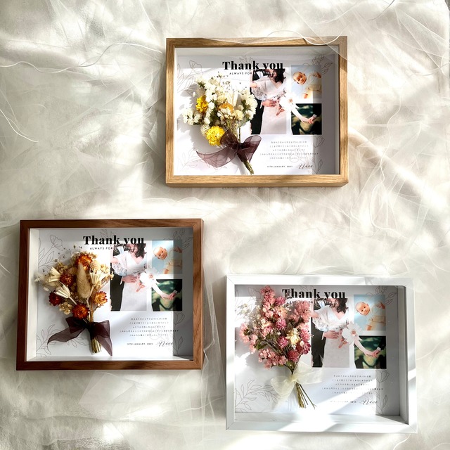 …………………………………………………….. 両親贈呈品 子育て感謝状 piacere …………………………………………………….. セミオーダー式でドライフラワーやフレームのカラーはお選びいただけます 感謝のメッセージは定型文もご用意しておりますが、オリジナル文でも承っております インテリアにも取り入れていただきやすいデザインとサイズ感です ……………… 商品概要 ……………… 〖ドライフラワーブーケ〗 下記の4色からお選びいただけます。 1.ナチュラルピンク 2.くすみピンク 3.オレンジ 4.イエロー 〖フレームボックス〗 下記の3色からお選びいただけます。 1.木目調ベージュ 2.ホワイト 3.木目調ブラウン 〈仕様〉 ・サイズ:厚さ4.5cm × 幅25.4cm × 高さ20.3cm ・材料:ウッド・アクリル 〖お届けまでの流れ〗 ●ご購入から3日以内にご入力フォームの送信をお願いいたします ご入力フォームにつきましては、ご購入後取引メッセージにてご案内いたします ●入力フォームに送信後、7日以内に発送させていただきます ご入力いただいた内容で製作・発送をさせていただきます。 ※原則お客様の校正はありませんが、確認のため連絡させていただく場合がございます。 ※お急ぎの方はコメントにてご相談ください ……………… オプション ……………… ギフトボックス・ショッピングバッグ:2個+1,100円 ……………… 納期・発送 ……………… 〖納期〗 ご購入・お支払い日から7日以内に発送させていただきます 〖発送〗 ゆうパックまたは宅急便(ヤマト運輸)でのお届けとなります 発送時にメールにてお知らせいたします ……………… 注意事項 ……………… ※自然素材のため実際のお花の色合いが若干異なる場合がございます _____ ご注文済みの方 _____ ご購入から3日以内に入力フォームの送信をお願いいたします ▼ https://forms.gle/WpaqXfrYJf1ABkVv9