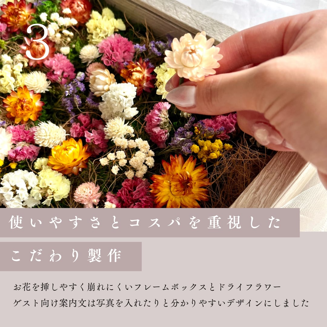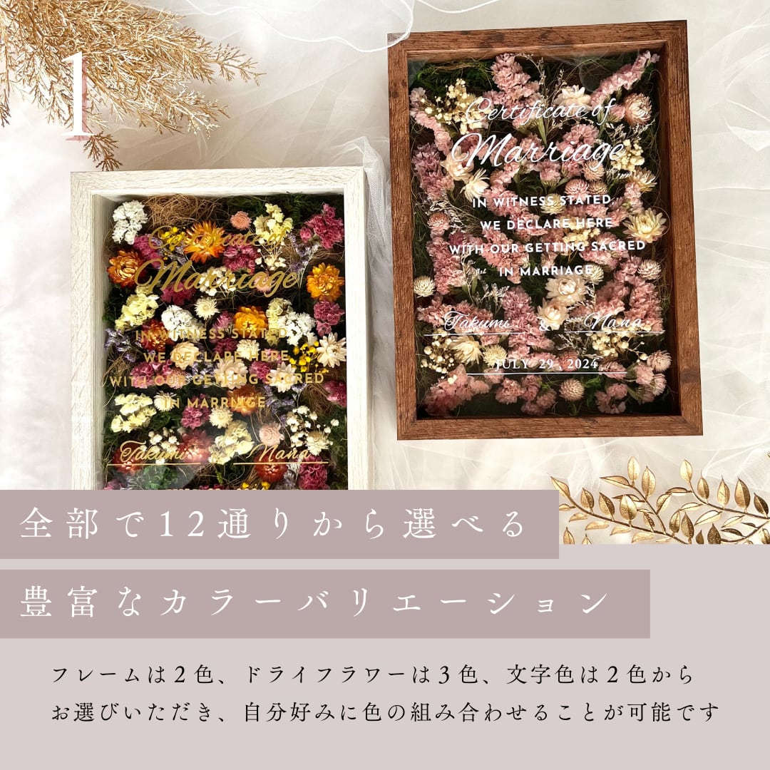 ドライフラワー3色、フレームボックス2色、文字色2色から各1色お選びいただけます