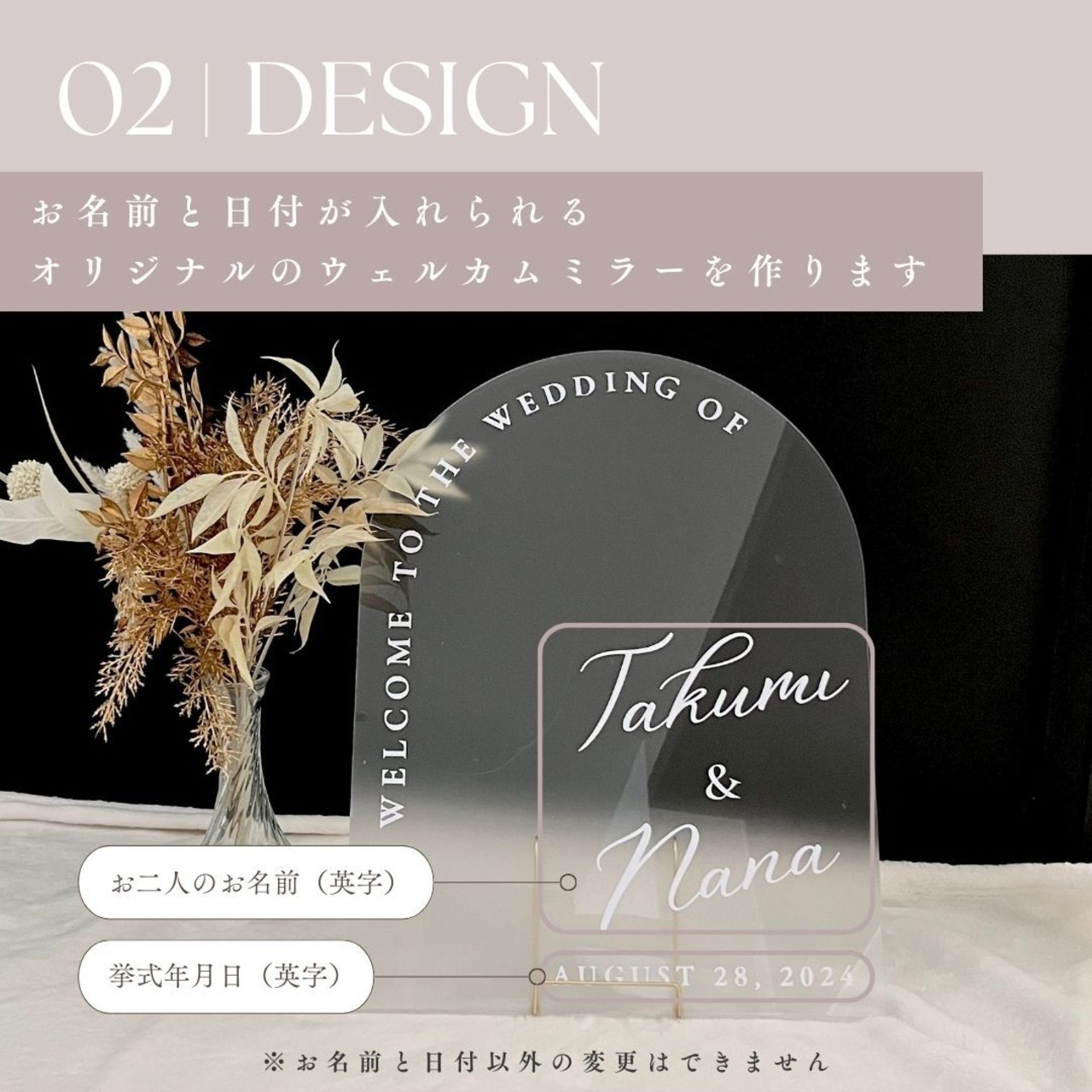 韓国風のアーチ型アクリルボードにおふたりのお名前、挙式日を印字し、